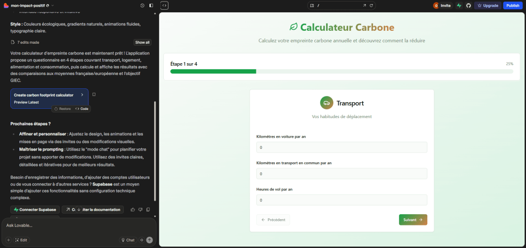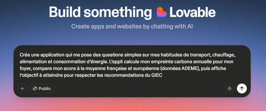 « Crée une application qui me pose des questions simples sur mes habitudes de transport, chauffage, alimentation et consommation d’énergie. L’appli calcule mon empreinte carbone annuelle pour mon foyer, compare mon score à la moyenne française et européenne (données ADEME), puis affiche l’objectif à atteindre pour respecter les recommandations du GIEC. »
